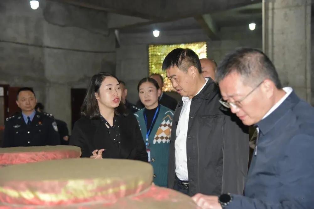 泸州市人民政府副市长、市公安局局长何绍明(前排右二)一行调研中国沈酒庄景区内扶贫+旅游三产融合白酒仿古一条街,叙永县委常委、政法委书记何猛(前排右一),叙永县向林镇党委书记王珂(前排左一),中国沈酒集团总经理沈连(前排左二)陪同