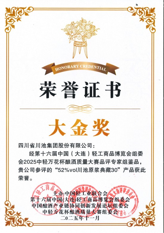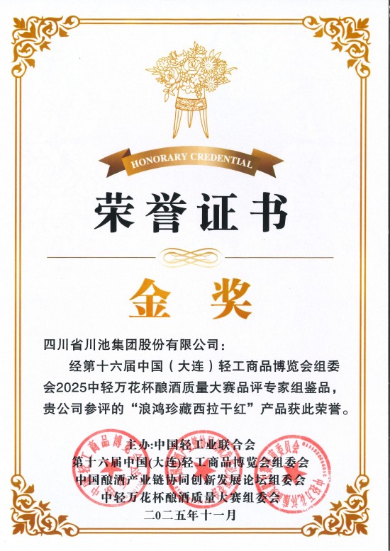在本届博览会首次举办的2025中轻万花杯酿酒质量大赛中,四川省川池集团股份有限公司旗下产品“川池原浆典藏30”“浪鸿珍藏西拉干红”凭借卓越品质和深厚文化,分别斩获“大金奖”“金奖”两大重磅奖项。