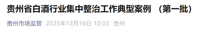 据贵州省市场监管局官方平台“贵州市场监管”2025年12月16日消息,贵州省市场监管局(省知识产权局)持续牵头开展白酒知识产权守护行动,在全省范围内开展白酒行业集中整治,办理了一批案件。公布的第一批典型案例涉及的企业有:贵州祥康酒业(集团)有限公司、仁怀市帝坛酒业有限公司、仁怀市茅台镇怀桥酒厂、贵州酱王酒业有限公司、仁怀市亚飞酒业销售有限公司、贵阳市花溪兰花山酒厂。