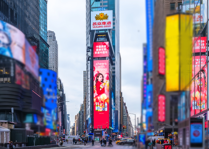 在品牌声量不断提升的同时,燕京啤酒的国际化传播也迈出关键一步。新年期间,燕京啤酒品牌广告登陆美国纽约时代广场大屏,以“中国燕京,邀请世界欢度中国年”为主题,将中国春节文化与全球地标场景创新融合。这标志着燕京啤酒国际化战略的全面升级——从单纯的产品贸易走向“品牌+文化+产品”三位一体的系统出海。