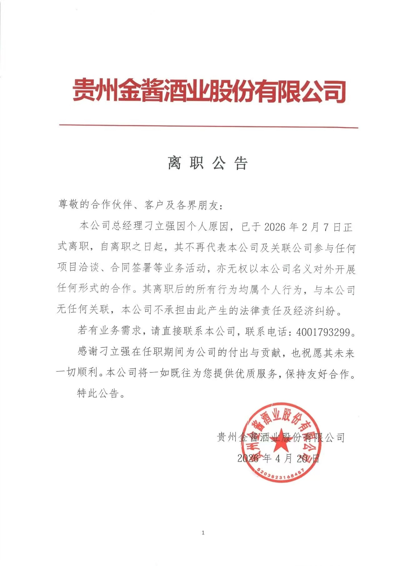 4月20日,金酱酒业发布声明称,公司总经理刁立强因个人原因,已于2026年2月7日正式离职,自离职之日起,其不再代表本公司及关联公司参与任何项目洽谈、合同签署等业务活动,亦无权以本公司名义对外开展任何形式的合作。其离职后的所有行为均属个人行为,与本公司无任何关联,本公司不承担由此产生的法律责任及经济纠纷。(宽窄研究院)